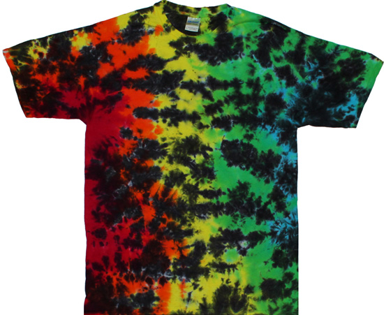A quality and vibrant multi-color tie dye crinkle t-shirt dyed in an awesome vertical pattern. Colors just fade into each other with a multi-color rainbow spectrum featured in a one of a kind design. A high quality design dyed on a heavy weight shirt that will last and last with cold water washes.